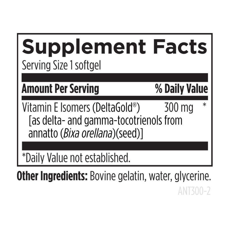 Ingredients: Each softgel contains 300 mg of delta/gamma tocotrienols. Other ingredients include softgel (gelatin, glycerin, purified water, annatto seed extract).