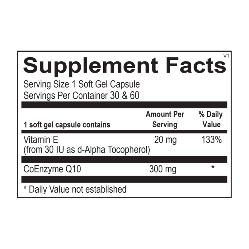 Ingredients: Vitamin E (from d-Alpha Tocopherol), CoEnzyme Q10. Other ingredients include D-Limonene Oil, Gelatin, Glycerin, Purified Water, Mixed Tocopherols, Red Radish Powder, Carob Extract Concentrate, Caramel Liquid, and Medium Chain Triglycerides.