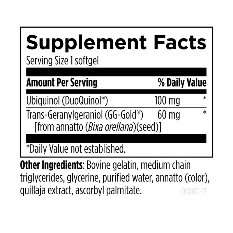 Ingredients: Ubiquinol (as DuoQuinol®), Geranylgeraniol (GG) extracted from annatto seeds. Other ingredients include quillaja extract and medium-chain triglycerides.