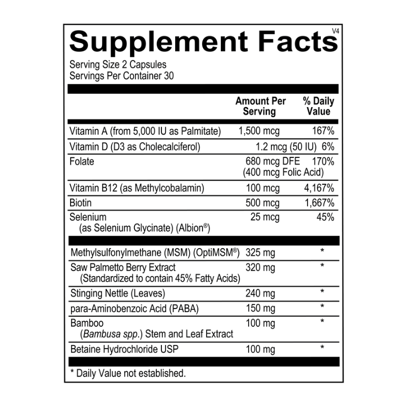 Cosmedix delivers targeted nutrients like biotin, vitamin A, MSM, saw palmetto, and bamboo-derived silica to reinforce the building blocks of healthy hair and skin. It contains betaine HCl for enhanced protein digestion—critical for collagen production—and OptiMSM® to provide sulfur, a key structural component in skin, hair, and connective tissue. Saw palmetto supports hormone balance, while selenium, folate, and methylated B12 round out a formula designed for cellular beauty and hormonal harmony.