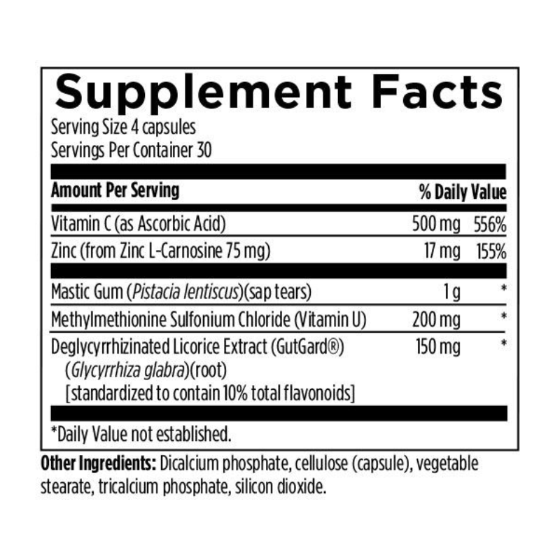 Ingredients: Deglycyrrhizinated Licorice (DGL), Zinc Carnosine, Mastic Gum, Methylmethionine Sulfonium. Other ingredients include Hypromellose (Natural Vegetable Capsules), Microcrystalline Cellulose, Magnesium Stearate, and Silicon Dioxide.