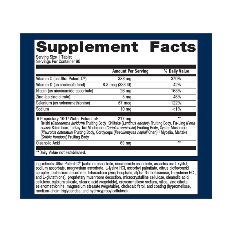 Ingredients: Ultra Potent-C® [calcium ascorbate, niacinamide ascorbate, ascorbic acid, xylitol, sodium ascorbate, magnesium ascorbate, L-lysine HCl, ascorbyl palmitate, citrus bioflavonoid complex, potassium ascorbate, tetrasodium pyrophosphate, alpha D-ribofuranose, L-cysteine HCI, and L-glutathione], proprietary mushroom decoction, microcrystalline cellulose, oleanolic acid, cellulose, calcium silicate, stearic acid (vegetable), croscarmellose sodium, silica, zinc citrate, selenomethionine, magnesium stearate (vegetable), cholecalciferol, and coating (hypromellose, medium-chain triglycerides, and hydroxypropylcellulose).