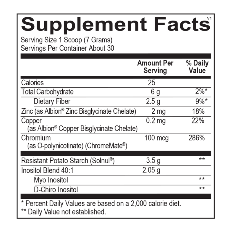 The inositol blend mimics the body’s natural ratio and is shown to enhance insulin function, reduce androgen levels, and support ovulation. Solnul® resistant potato starch promotes gut health and metabolic stability by feeding beneficial bacteria and improving glucose metabolism. Zinc, chromium, and copper contribute to improved insulin sensitivity, antioxidant protection, and hormonal regulation.*