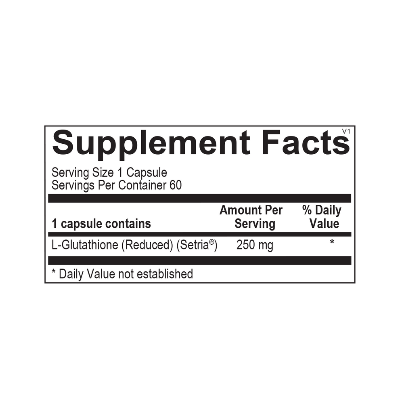 Ingredients: Setria® Glutathione (Reduced) 250 mg. Other ingredients include Hypromellose (Natural Vegetable Capsule), Microcrystalline Cellulose, Silicon Dioxide, and Magnesium Stearate.