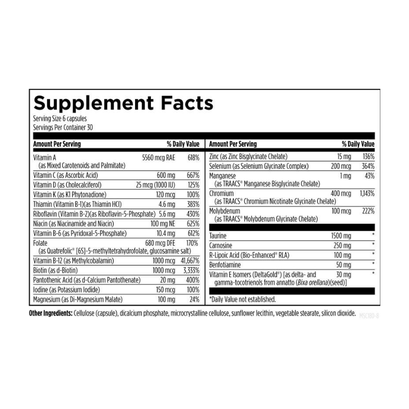 Description: Metabolic Synergy™ is a specially formulated blend of nutrients designed to support healthy blood glucose levels and insulin sensitivity. This comprehensive formula helps maintain healthy glucose and insulin metabolism while supporting the conversion of carbohydrates into energy by providing essential nutrients for the tricarboxylic acid (TCA) cycle. Metabolic Synergy™ includes chromium, zinc, selenium, manganese, and molybdenum as true chelates for maximum absorption and bioavailability. Additionally, it contains optimal levels of R-lipoic acid, taurine, and carnosine to support healthy glucose metabolism.