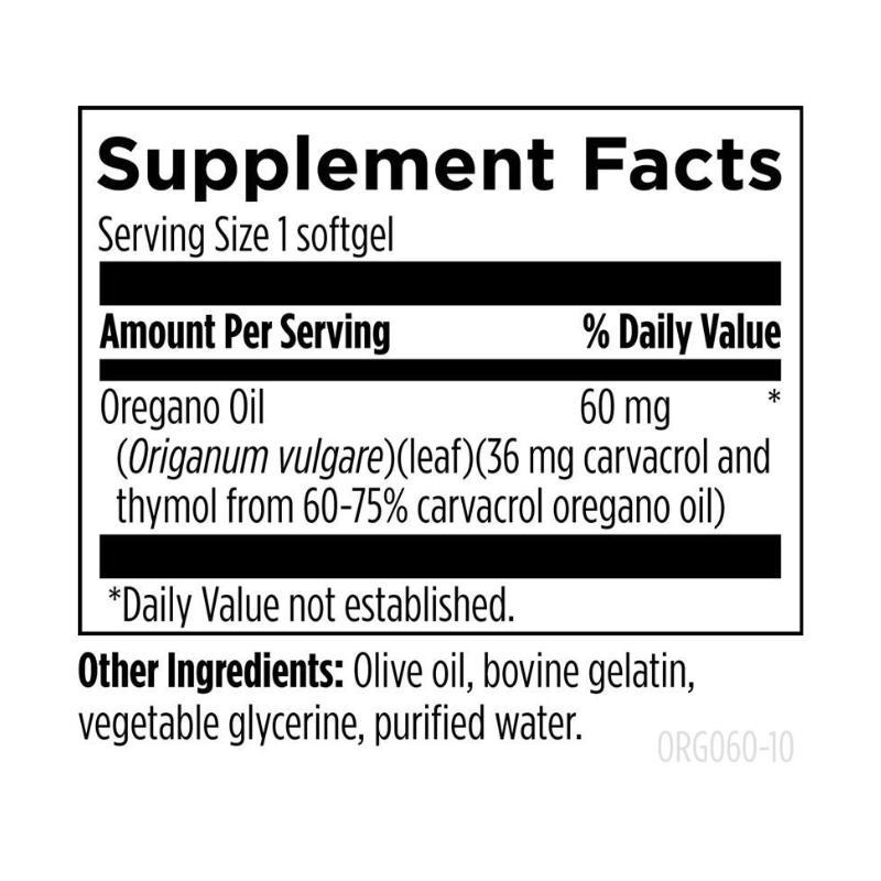 Ingredients: Oil of Oregano (Origanum vulgare) (aerial parts), Olive Oil. Other ingredients include Softgel Capsule (gelatin, glycerin, purified water).